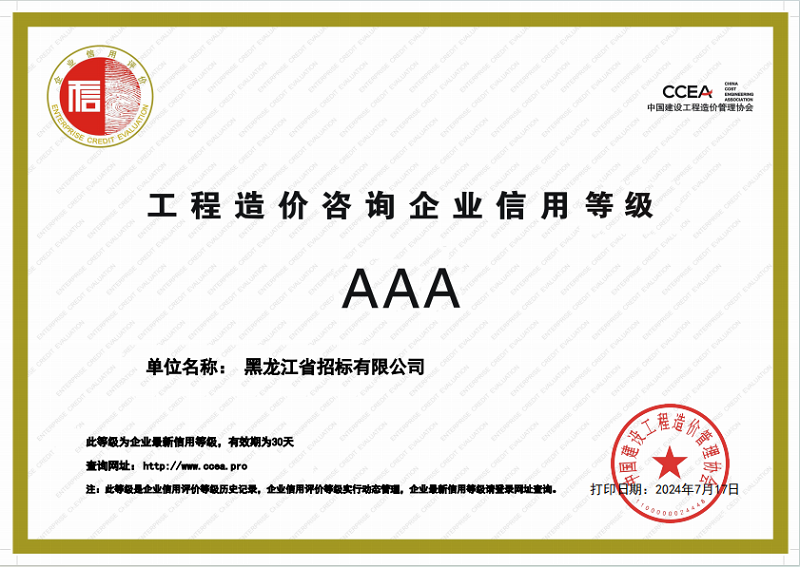 喜報!省招標有限公司榮獲“工程造價咨詢企業AAA級”信用評價